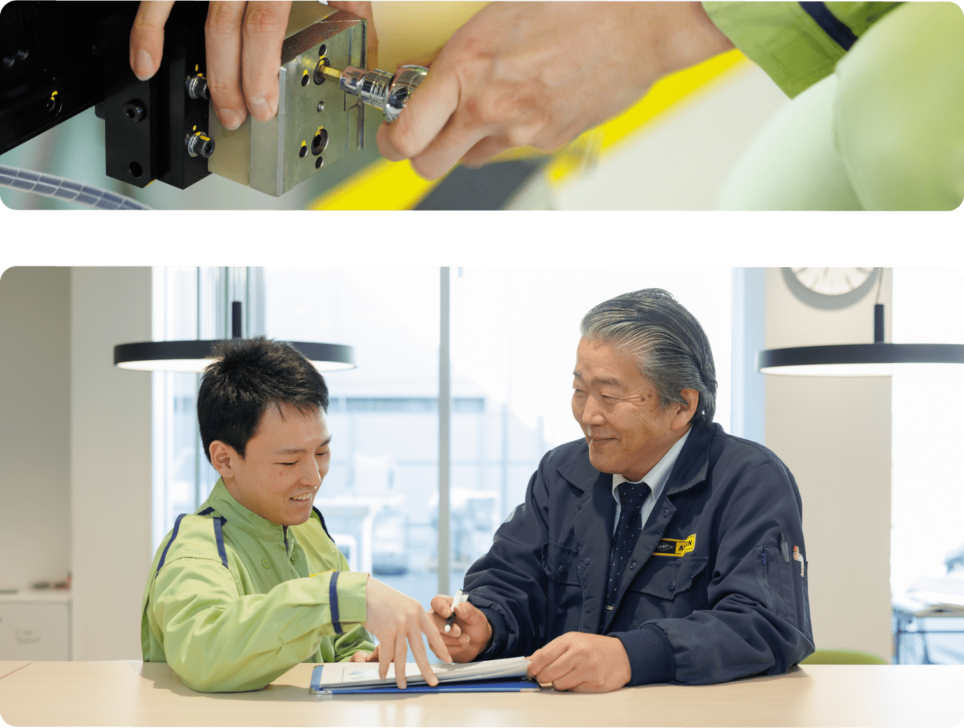 安全自動車は現在、4輪同時にタイヤの角度を測定できる「アライメントテスター」や、多様化するランプに幅広く対応した「ヘッドライトテスター」の開発により、大手自動車メーカーから高い評価と信頼を得ています。新しい製品を生み出し、未踏の領域に挑戦することで、安全自動車は自動車技術の最前線に立ち続けています。その挑戦を支えるのは、安全自動車の研修システムと先輩たちの指導によって自信を身に付けた、社員一人ひとりの日々の挑戦です。