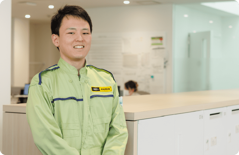 機械全般に昔から興味があり、大学では理工学部に在籍。センサー関連の研究を行っていました。安全自動車の会社説明会を受けた時に「自動車はエンジンをはじめ、多様な機械やシステムの集合体であり、その整備や修理にも多ジャンルの専用機器が必要とされている」と聞き、他企業よりも多彩な機械に関わる機会があると考え入社しました。入社後は業界の基礎から学ぶ新入社員研修を同期と一緒に受け、その後名古屋に配属。製品の点検、修理、製品見積、製品の提案、工事の立ち合いなどをOJT制度の一環として複数部門で経験し、現在はお客様からの問い合わせの一次対応を行うサービスフロントを担当しています。