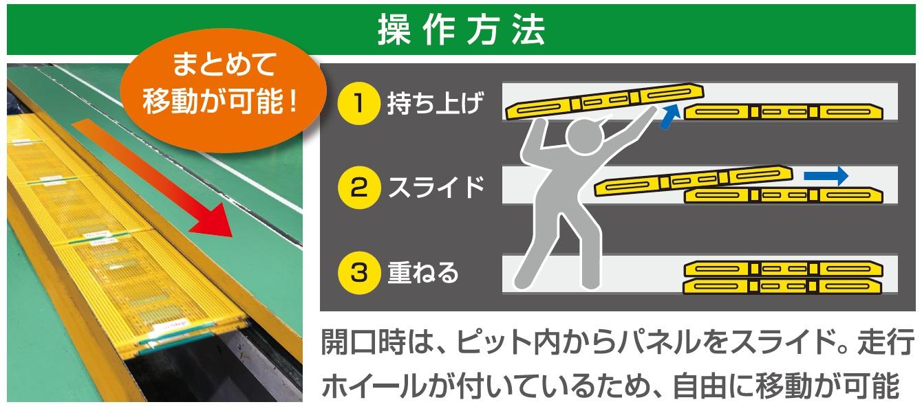 ※ パネルはピット開口長に合わせて枚数の選択が可能※ パネルは2枚重ねにすることで開口部を作るため開口長さはカバー範囲の半分となり、全開は不可