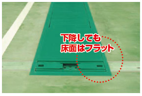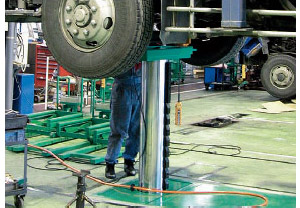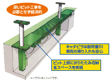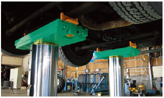 キャタピラターン方式のため上面は床面とフラットとなり、作業の安全性に優れています。また作業場の美観も保たれて作業環境が向上します。受台部は床面と同位置まで下がり、低床バスでも乗り入れ・退出が容易にできます。周辺機器の利用により、タイヤ・ホイール、部品の脱着など、一連の作業の効率も一段とアップします。