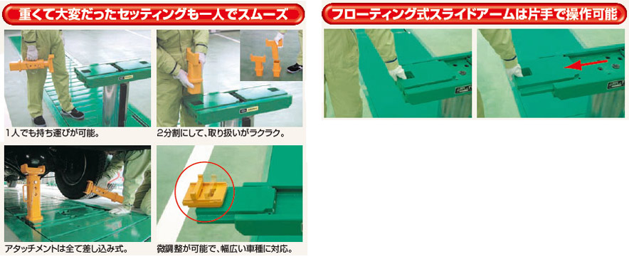 より低い位置での引き出しが可能になった受台は、車両フレームへのセットがラクラク。ローラーを利用したフローティング式スライドアームは片手でも操作が可能です。アタッチメントは軽量で、一人でも取り付けカンタン。作業者の負担が軽減され、安全・確実にセッティングできます。受台、アタッチメントともに全高が低くなったため、低床車にも幅広く対応できます。