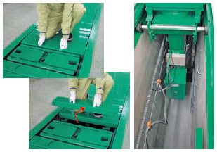 キャタピラの一部を簡単に取り外し、ピットをフルオープンにできるので、より点検がラクにできます。リフト移動時、キャタピラは巻き込み式ではなく、たたんで中吊り格納するので、ごみ等を振り落としカミ込みも防ぎます。